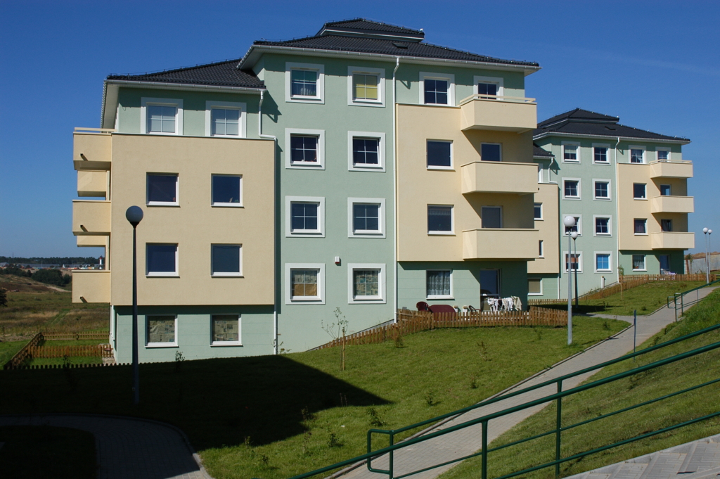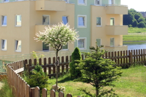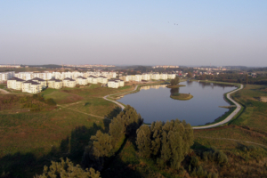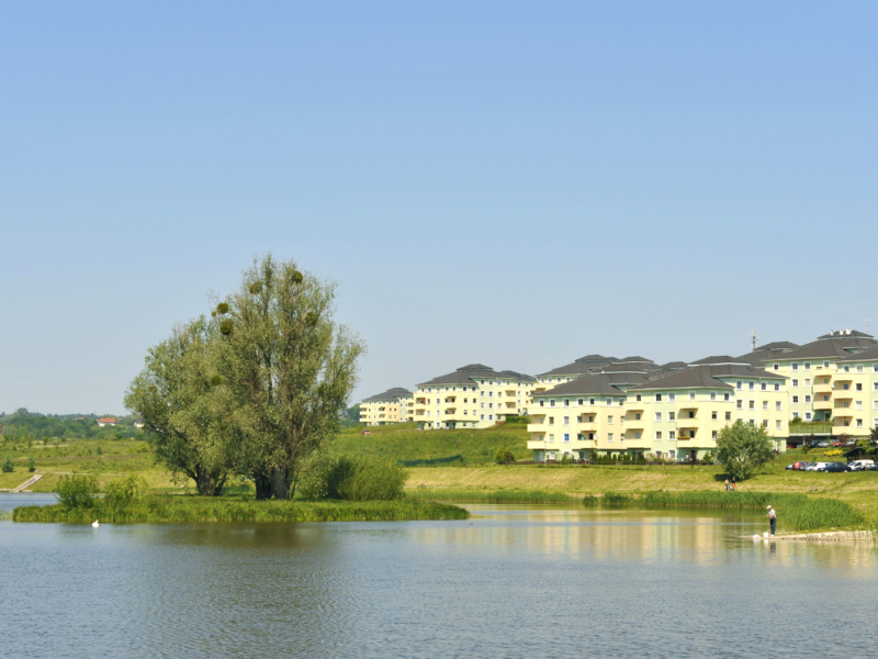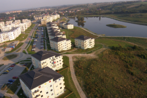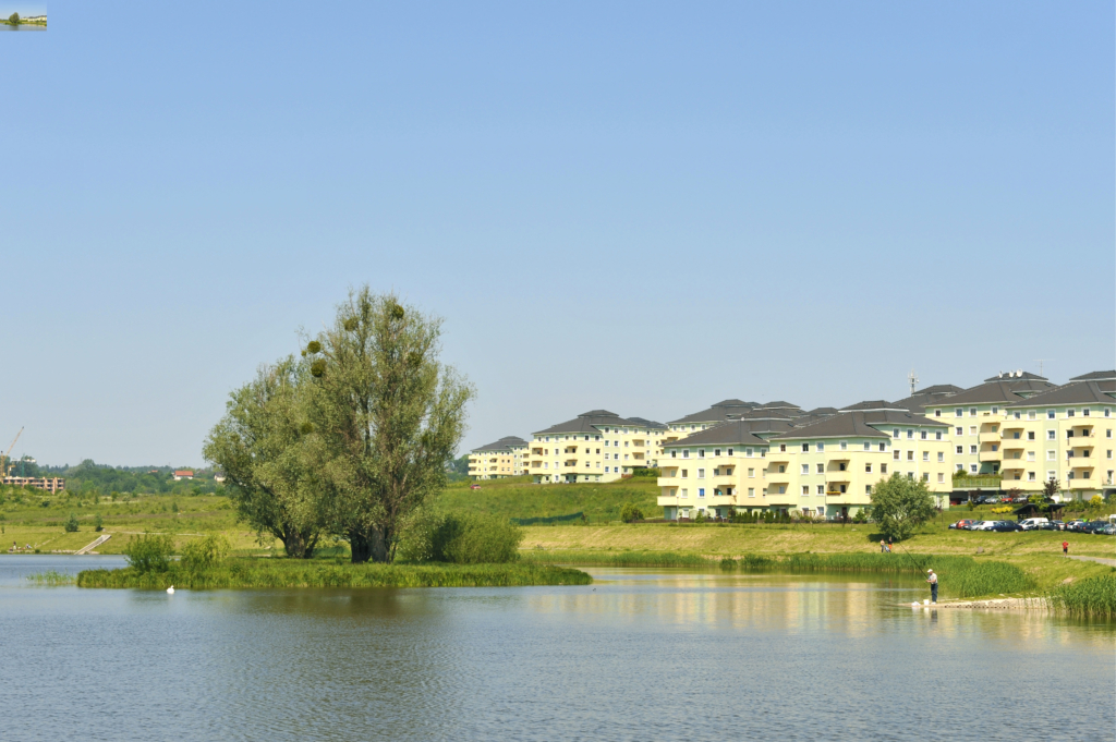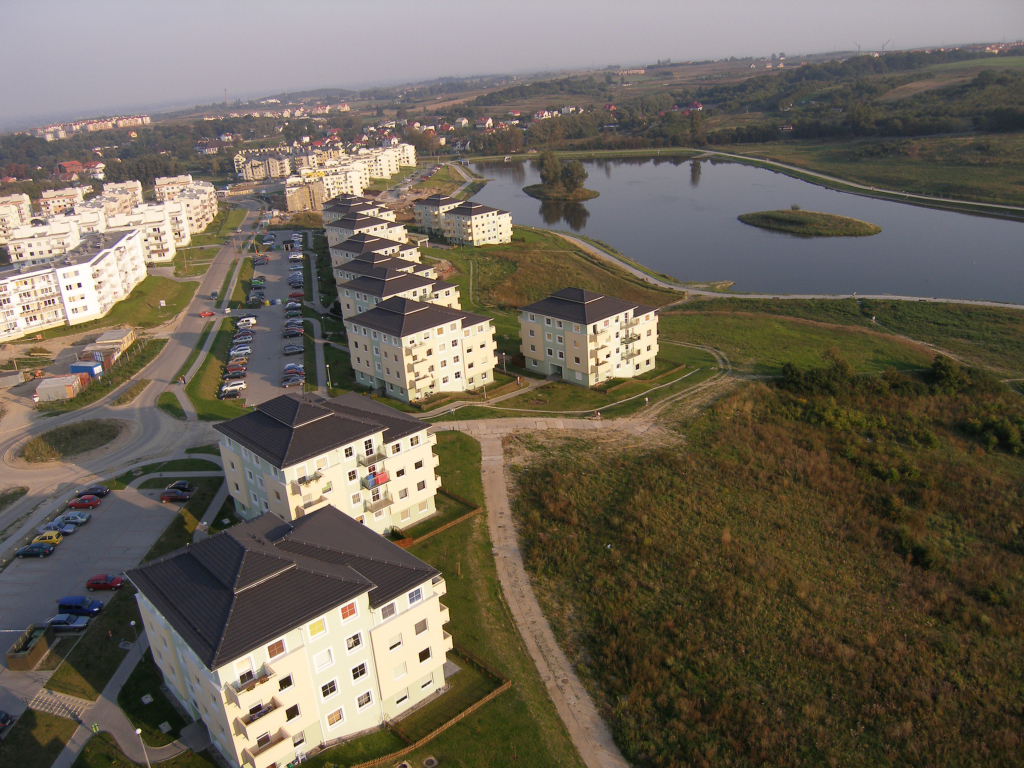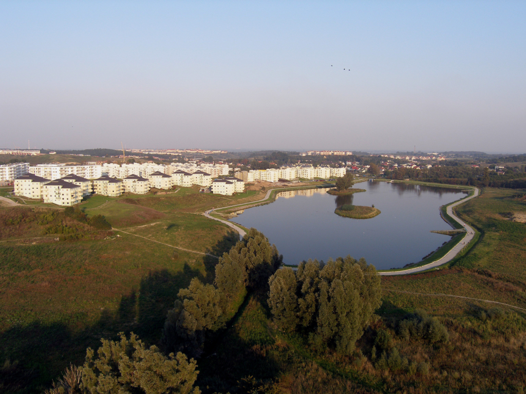 Dzielnica Pięciu Wzgórz powstała w Ujeścisku-Łostowicach, bezpośrednio nad zbiornikiem wodnym Świętokrzyska. Zabudowę tworzą budynki typu Villa Park – kameralne, mieszczące od 16 do 20 mieszkań. Centralnie zaprojektowana klatka schodowa pozwoliła uzyskać więcej mieszkań narożnych, dobrze doświetlonych z dwóch stron. Duże okna otwierają wnętrza na wodę i zieleń, a balkony zaprojektowaliśmy tak, by chroniły prywatność, nie odbierając światła ani widoku. Budynki naturalnie wpisują się pagórkowaty teren, dzięki czemu z wielu mieszkań otwierają się szerokie panoramy na wodę i okoliczną zieleń.